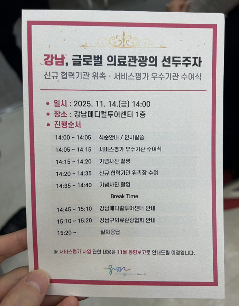지난 11월 14일 강남메디컬투어센터에서, 서울 강남구가 주최한 “2025 강남 글로벌 의료관광” 행사에 다녀왔습니다.