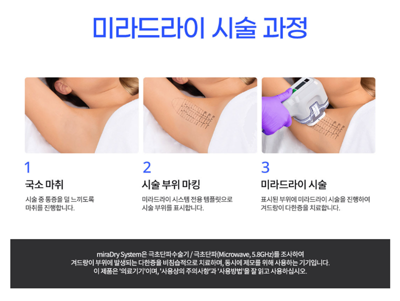 미라드라이는 어떤 원리인가요? 미라드라이는 마이크로웨이브 에너지를 이용해 겨드랑이 땀샘에 선택적으로 작용하는 방식입니다. 땀샘 자체의 수를 줄이는 원리를 기반으로 하기 때문에 일시적으로 분비를 억제하는 보톡스와는 접근 방식이 다릅니다. 땀이 많은 체질인데 효과가 있을까요? 결론부터 말씀드리면 개인 상태에 따라 도움이 될 수 있습니다. 다만 몇 가지를 이해하셔야 합니다. 1. 땀이 “많은 체질”의 의미 선천적으로 땀샘이 많은 경우, 긴장 시 땀이 급증하는 경우, 운동량이 많은 경우, 체온 조절이 활발한 체질 이 중 겨드랑이 국소 다한증에 해당하는 경우 상담 대상이 될 수 있습니다. 2. 땀이 완전히 안 나게 되나요? 미라드라이는 땀을 0으로 만드는 시술은 아닙니다. 전체 땀샘의 일부에 작용과도한 분비를 줄이는 목적으로 진행됩니다. 따라서 운동이나 더운 환경에서는 여전히 땀이 날 수 있습니다 3. 땀 많은 체질은 효과가 약한가요? 꼭 그렇지는 않습니다. 다만 땀샘 밀도가 높은 경우, 증상이 심한 경우 1회 시술 후 추가 상담이 필요할 수 있습니다. 개인에 따라 1회로 만족하는 경우도 있고추가 시술을 고려하는 경우도 있습니다. 이런 분들이 상담 대상이 될 수 있습니다 1. 하루에도 여러 번 옷을 갈아입는 경우 2. 데오드란트를 장시간 사용해야 하는 경우 3. 액취 냄새가 동반되는 경우 4. 보톡스 효과가 짧았던 경우 단, 정확한 적합 여부는 상담과 상태 확인 후 결정됩니다. 부작용이나 회복 기간은 어떤가요? 시술 후, 붓기, 압통 일시적인 감각 저하 등이 나타날 수 있으며 대부분 회복 과정에서 완화됩니다. 초기 며칠간은 격한 운동과 사우나는 피하는 것이 좋습니다.