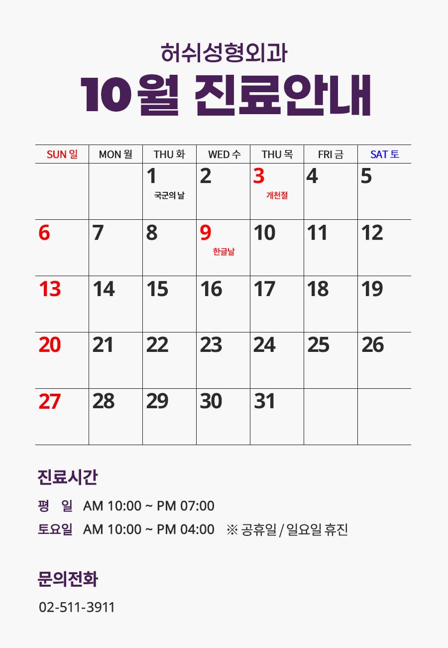 [허쉬성형외과] 2024년 10월 진료일 안내