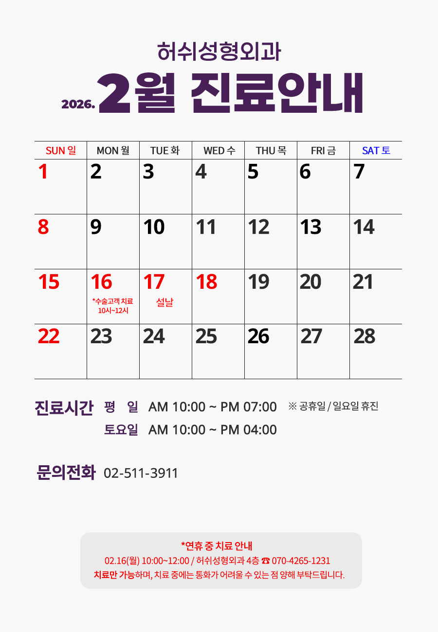 [허쉬성형외과] 2026년 2월 진료일 안내